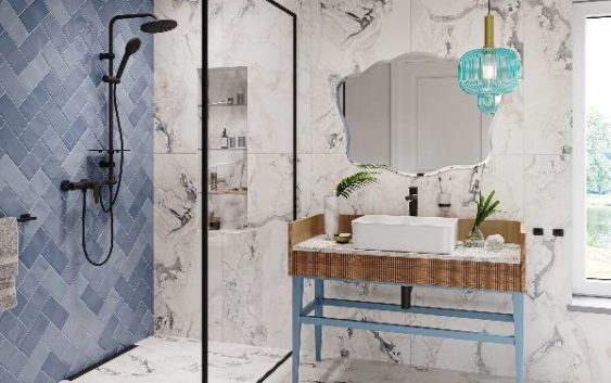 Bateria ścienna mocowana jest bezpośrednio do instalacji wody. To najbardziej tradycyjny sposób montażu, co jednak nie oznacza, że bateria natryskowa musi być staroświecka. Nowoczesne modele ścienne charakteryzują się wyjątkowo interesującym designem. Przykładem model Algeo Black wybrany do aranżacji z błękitnymi płytkami zestawionymi z kaflami o fakturze białego marmuru. Na tym tle projektant wyeksponował oryginalną armaturę w matowym, czarnym kolorze z chromowanymi łączeniami. Bateria ma korpus o cylindrycznym kształcie i wygodny płaski uchwyt. Wyposażono ją w regulator ceramiczny, który zapewnia jej długie i bezawaryjne działanie. Producent daje na urządzenie 5 lat gwarancji. Do baterii dopasowano luksusowy, czarny zestaw natryskowy przesuwny z deszczownią Rondo Lux Black, zaopatrzony w trzyfunkcyjną rączkę natrysku, system łatwego usuwania kamienia wapiennego easy clean i półkę na kosmetyki.