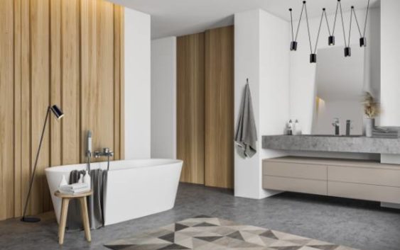 Uwagę zwracają przede wszystkim powierzchnie wyłożone okładziną przypominającą boazerie. Ich jasna barwa wchodzi w ciekawy dialog z białymi ścianami i szarym przecieranym betonem na podłodze. Podobną, ocieplającą wizualnie rolę odgrywa dywan w deseń z figur geometrycznych – doskonałe miejsce do codziennej gimnastyki – czy prosty taboret, pełniący funkcję podręcznej półki na ręczniki.