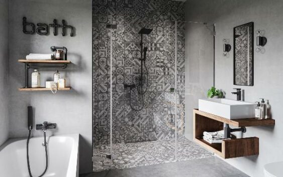 Projektanci nie boją się więc eksponować strefy prysznica, dobierając do niej wyraziste kafelki, a także przykuwającą uwagę armaturę, jak w industrialnej aranżacji o geometryczno-orientalnej mozaice w różnych odcieniach szarości. Za przeszkloną kabiną typu walk-in, czyli bez brodzika, z odpływem liniowym, wzrok przyciąga czarny zestaw natryskowy Squerto Lux Black z deszczownią o kwadratowej głowicy 20 na 20 cm. To urządzenie atrakcyjne wizualnie i funkcjonalne. Deszczownia i rączka zaopatrzone są w system easy clean, ułatwiający usuwanie kamienia wapiennego. Praktyczna płaska półka z regulacją mocowania jest idealnym miejscem na kosmetyki potrzebne w czasie kąpieli.