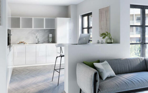 Kuchnia wyjątkowo jasna, bo z dominacją białych mebli, ale również pełna naturalnego światła wpadającego tu przez duże okna, dzięki czystym, minimalistycznym kształtom frontów mebli, idealnie wpisuje się w styl industrialnej aranżacji w klimacie soft. Całość wyróżnia subtelne połączenie nowoczesnych, oszczędnych form z delikatnymi, przyjaznymi dla oka materiałami. Jasne, neutralne kolory, takie jak biel i szarość, wprowadzają wrażenie świeżości i przestronności. Blaty i fronty szafek wykonane z gładkich, połyskujących materiałów podkreślają nowoczesny charakter wnętrza, a przy tym tworzą spójną, harmonijną aranżację.