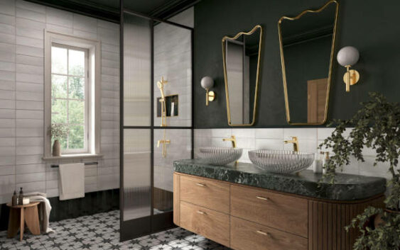 Styl retro jest przykładem nurtu, który wciąż powraca, przywołując atmosferę minionych dekad. Inspiracje z lat 50., 60. czy 70. ubiegłego wieku wprowadzają do projektów nutę sentymentalnego uroku, ale także odwagę w operowaniu kolorem i formą. Widać to na posadzce pokrytej kaflami o geometrycznym wzorze w czerni i bieli, nadającej rytm łazience. Ściany obłożone jasnymi, prostokątnymi płytkami z subtelnym połyskiem optycznie powiększają przestrzeń, odbijając światło wpadające przez okno, natomiast farba w głębokim odcieniu zieleni dodaje wyrazistości i intensywności.
