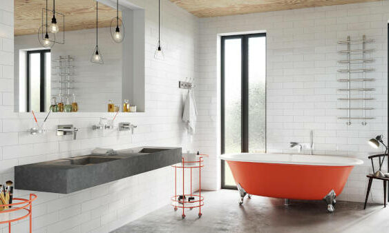 Białe płytki odbijają promienie wpadające przez wysokie przeszklenia, rozjaśniając otoczenie. Na ich tle wyróżnia się masywny, grafitowy blat ze wpuszczonymi umywalkami i wanna w energetycznym pomarańczu, wsparta na dekoracyjnych lwich łapach. Surowe elementy, jak betonowa posadzka, żarówki edisonki i druciane oprawy, nadają całości lekko loftowy klimat. Zastosowane baterie podtynkowe ALGEO marki FERRO o geometrycznych formach i chromowanym wykończeniu zachwycają prostotą. Mechanizmy ukryto w ścianie, dzięki czemu widoczne pozostają płaskie maskownice, wylewki i uchwyty. Wbudowane perlatory napowietrzają strumień, co pozwala ograniczyć zużycie wody.