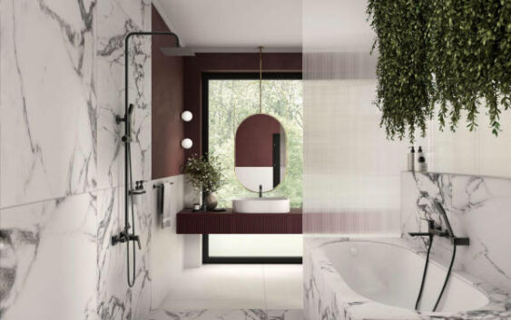 Centralne miejsce zajmuje umywalka umieszczona przy szerokim przeszkleniu, które otwiera widok na bujną zieleń. Lekka forma owalnego lustra w złotej ramie i okrągłych kinkietów uplastycznia wnętrze, tworząc nastrojowy klimat. Jagodowa szafka z pionowymi frezami akcentuje liniowość i przełamuje chłód kamienia. Minimalistyczna bateria VITTO BLACK VERDELINE o matowym wykończeniu i pochylonym korpusie podkreśla nowoczesny charakter strefy umywalkowej, a jej czarny kolor powtarzający się w części kąpielowej podtrzymuje wizualną konsekwencję. Baterie z tej serii wyposażono w perlatory oraz ograniczniki przepływu, co sprzyja ekonomicznemu użytkowaniu. Równoległe rozmieszczenie wanny i otwartego natrysku zapewnia czytelny układ funkcjonalny, a obłożenie obu stron marmurem o wyrazistym rysunku sprawia efektowne wrażenie monolitu.