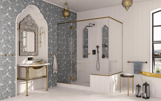 Białe powierzchnie współgrają z bogato zdobionymi detalami, rezultując wnętrzem pełnym kontrastów i wysmakowanej elegancji. Pod blatem z jasnego kamienia osadzonym na dekoracyjnym stelażu znajduje się misa umywalkowa w odcieniu różowego złota. Baterie ARDESIA marki FDESIGN zachwycają joystickowymi uchwytami o heksagonalnej fakturze. Podtynkowy montaż baterii zapewnia jej trwałość i łatwość w utrzymaniu czystości. Maskownice o delikatnie zaokrąglonych rogach odznaczają się na tle jasnych kafli. Ażurowe lampy, lustro w rzeźbionej ramie i nisze zakończone łukami, tworzą atmosferę luksusu.